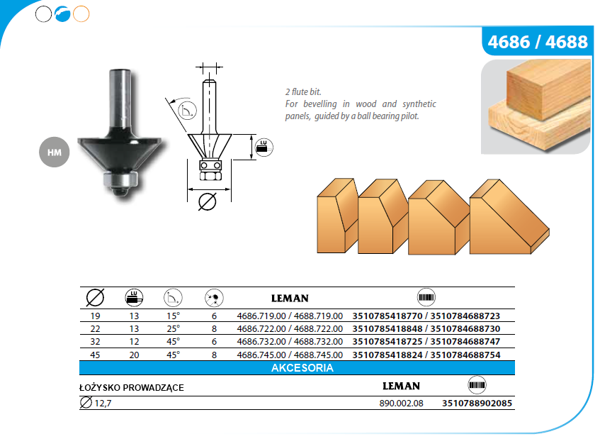 Frez trzpieniowy widiowy do drewna 32x12 trzpień 6mm kąt 45st. - Frez do ukosowania z łożyskiem prowadzącym dolnym, które umożliwia pracę z wykorzystaniem szablonu. Frez przeznaczony do obróbki drewna i tworzyw drewnopochodnych na frezarkach ręcznych.