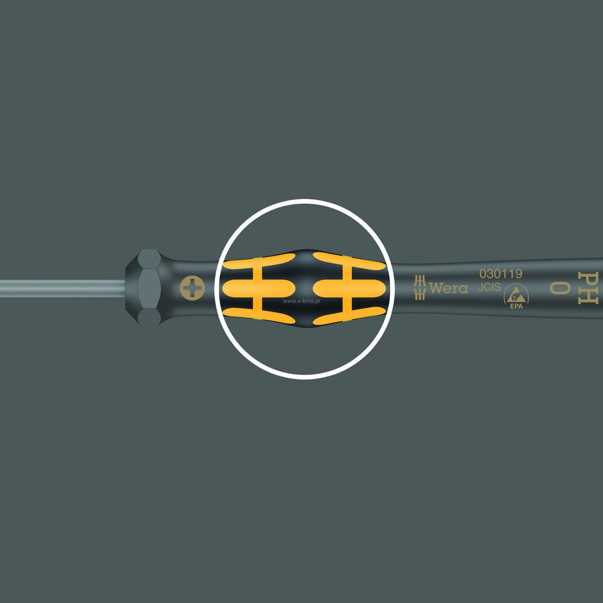 Zabezpieczony przed ładunkami elektrostatycznymi wkrętak Kraftform Micro. Ochrona przed ładunkami elektrostatycznymi i związanymi z nimi uszkodzeniami. Możliwość wsparcia dłoni na obrotowym kołpaku oraz strefa pokręcania znajdująca się bezpośrednio poniżej kołpaka umożliwiają szybkie obracanie wkrętaka palcami.